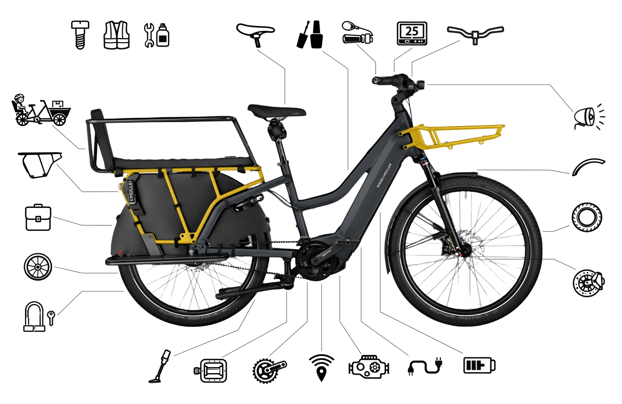 Que ce soit pour déposer les enfants à la maternelle, partir en excursion pour la journée, ou faire les courses en famille, le Multicharger Riese & Müller est prêt à relever tous les défis. La simplicité de sa conduite est comparable à celle d'un E-Bike classique, sans compromis sur la sécurité.